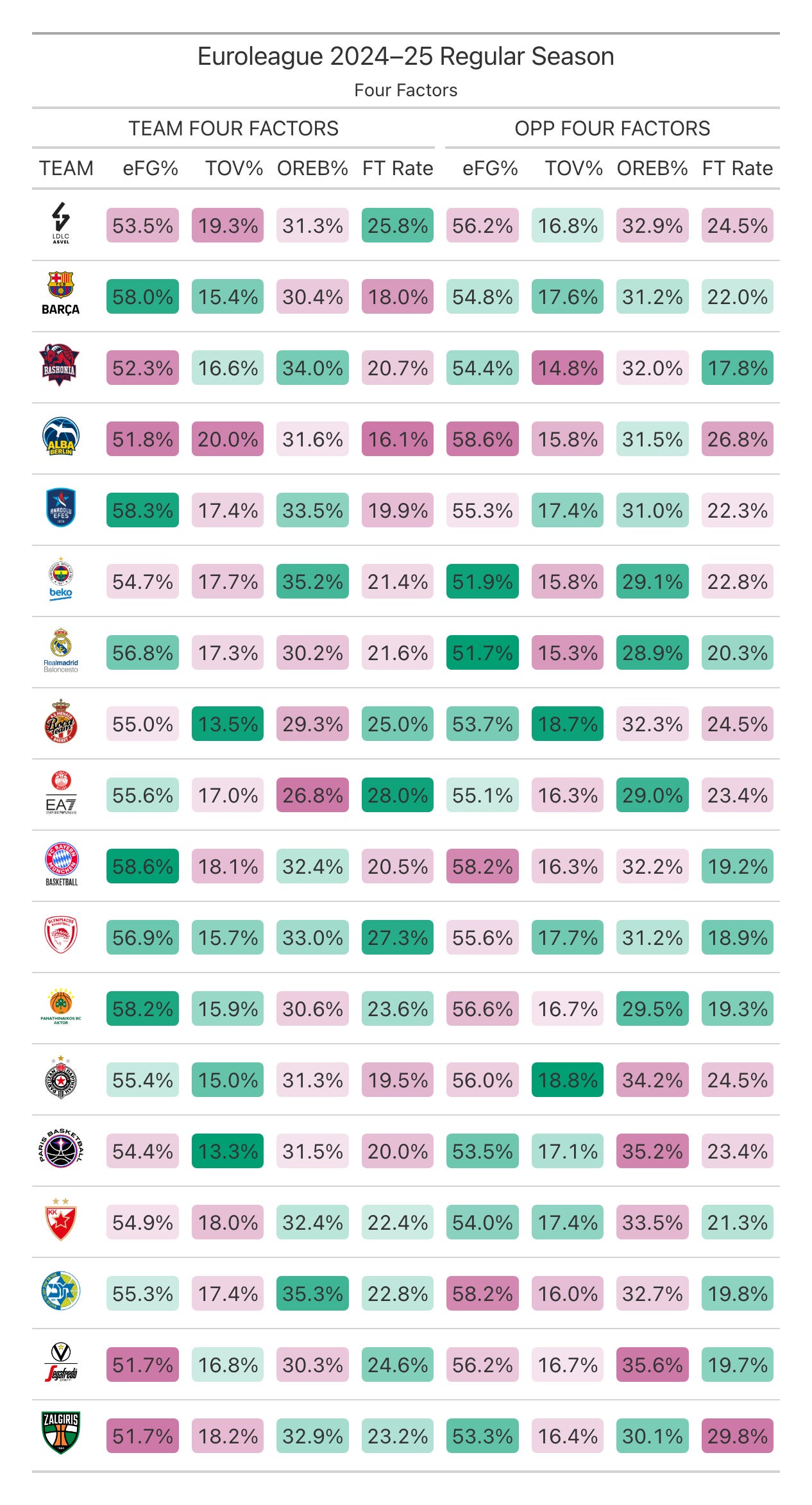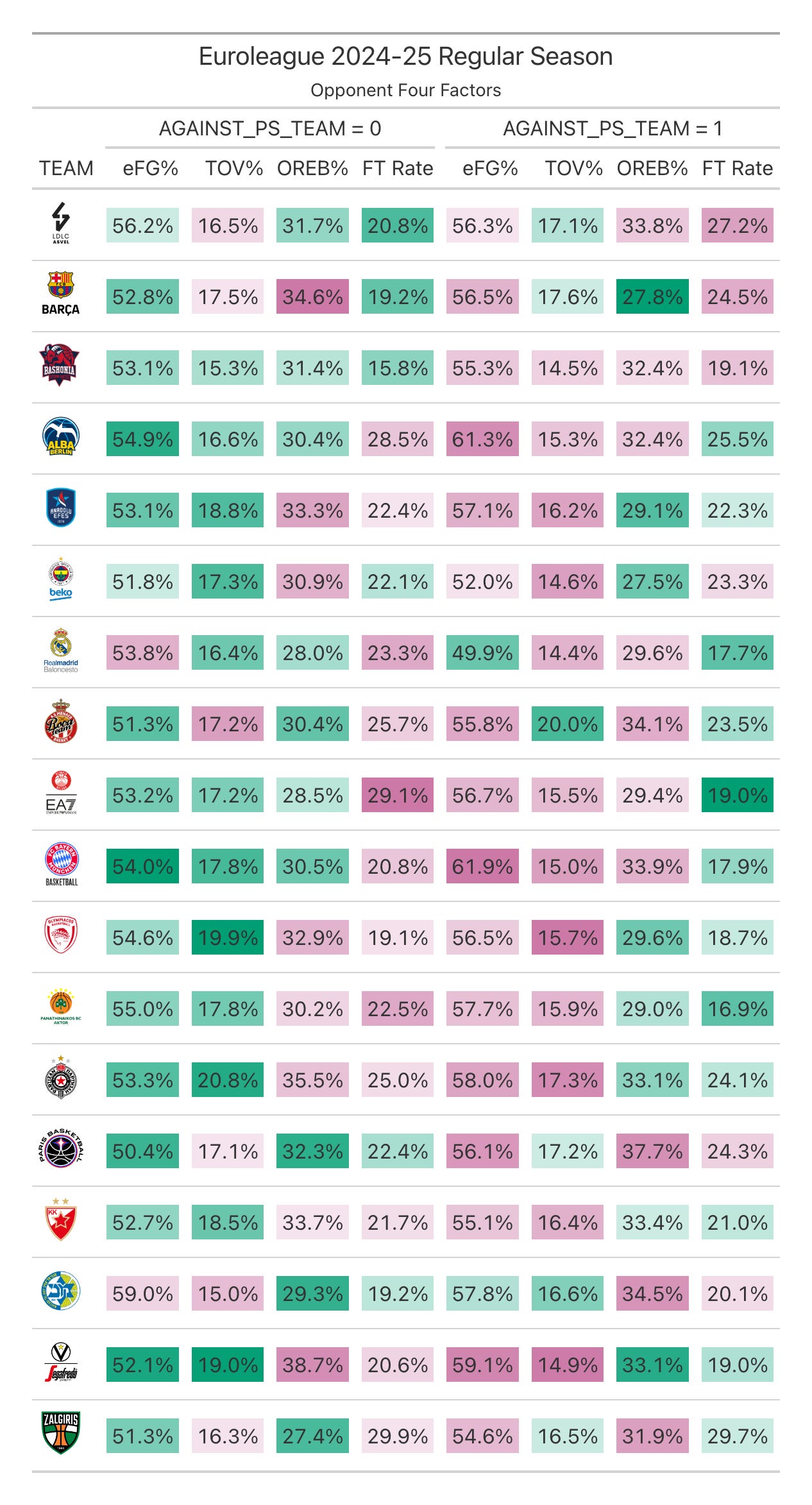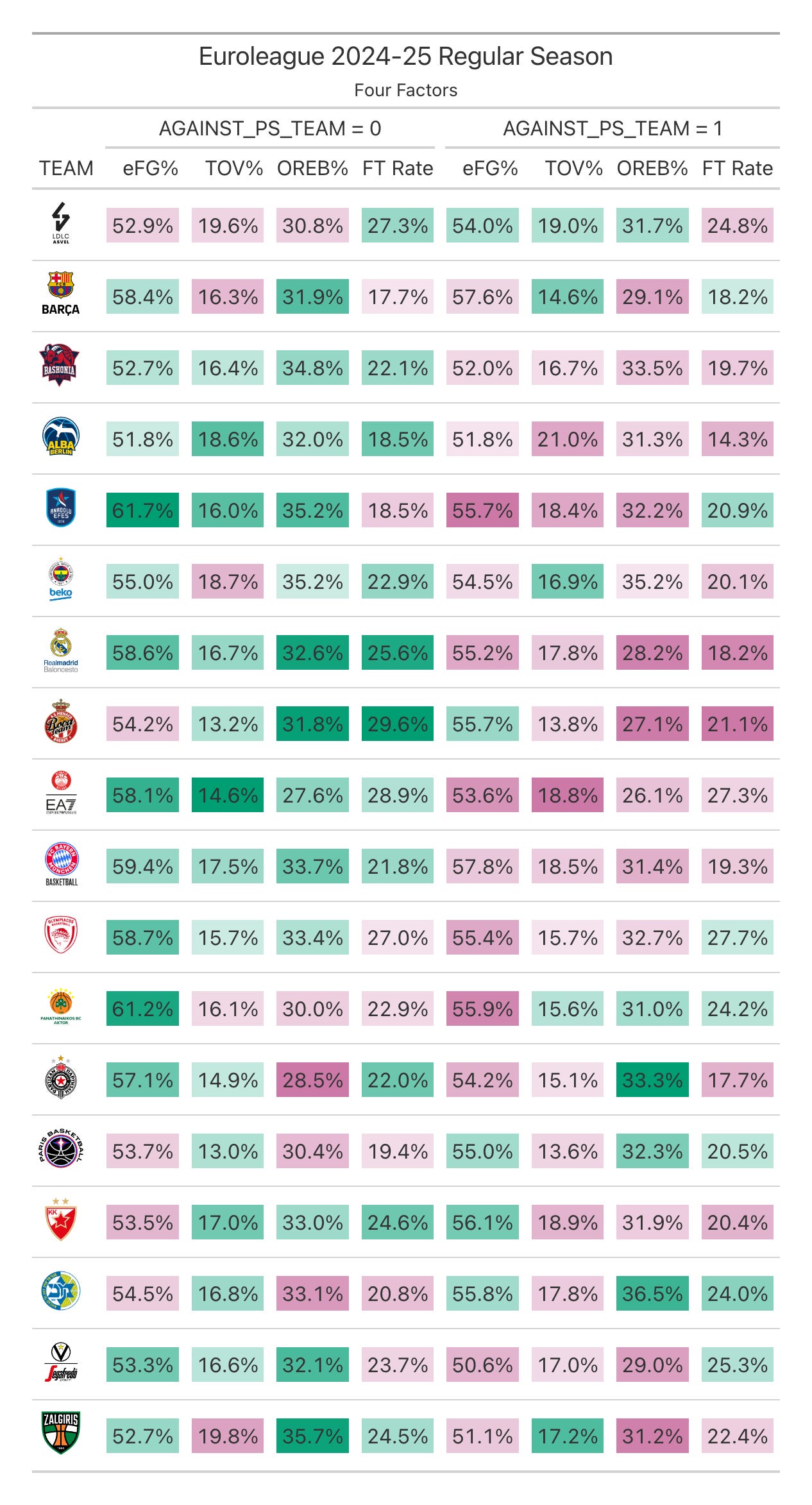 Now the color coding is row-wise. If a teams full green on the left side, it means they are performing better offensively against non-playoff teams. For example, Efes’ eFG% 6% lower against post-season teams (PS teams).